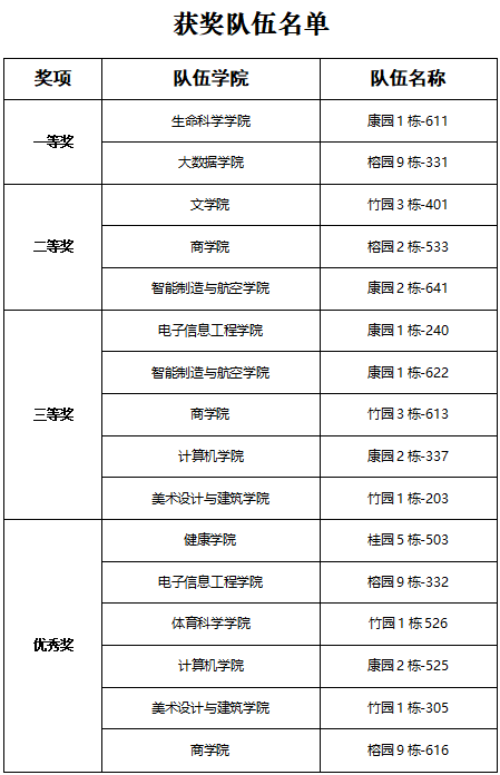 经过激烈比拼,活动评选出一等奖2队、二等奖3队、三等奖5队及优秀奖6队。电子信息工程学院副院长江赛标、保卫处副处长沈方龙、学生处副处长冯郡航、电子信息工程学院党委副书记崔磊等嘉宾分别为获奖队伍颁奖,鼓励同学们继续发扬团结协作精神,共建文明和谐宿舍。